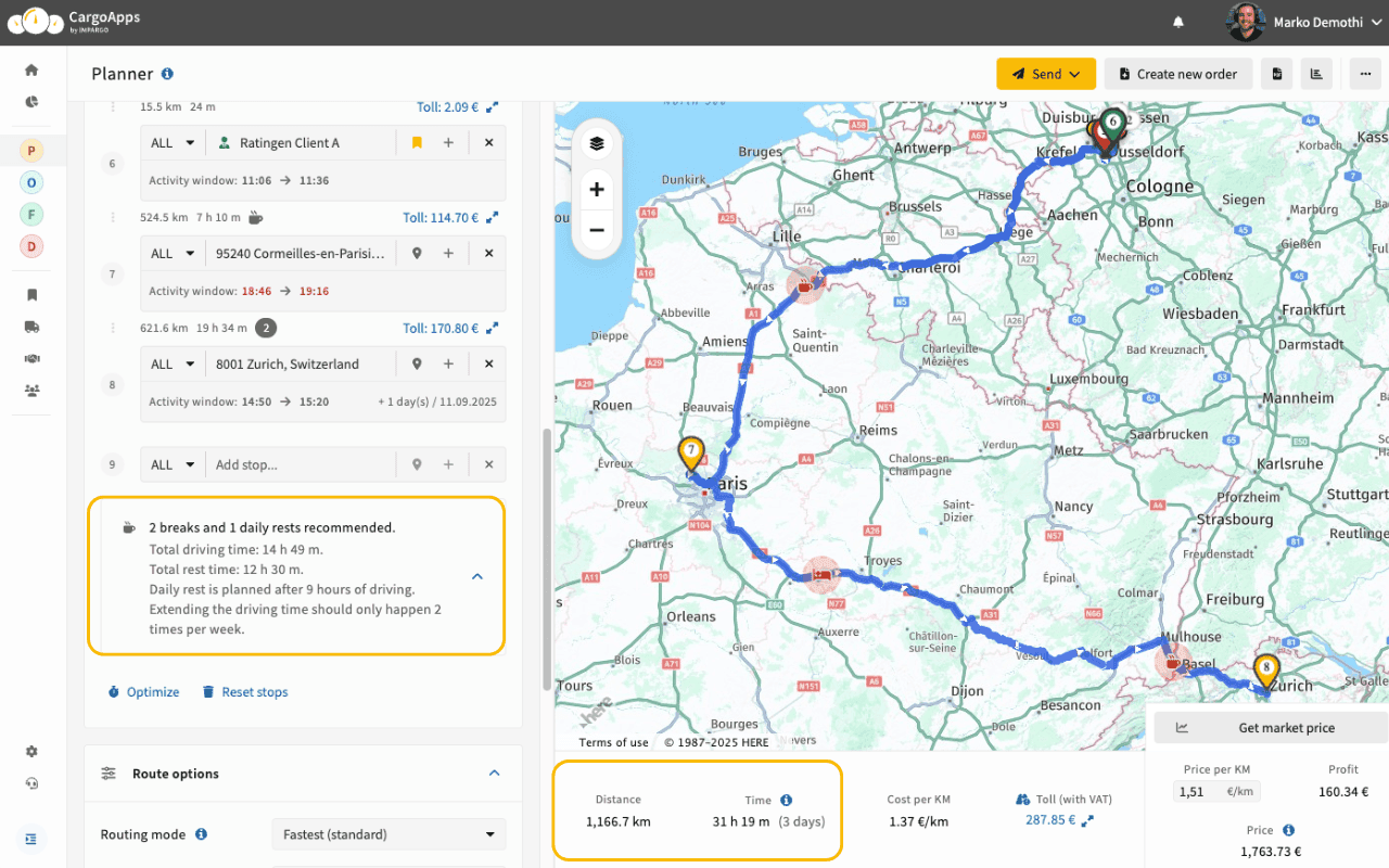 С нашия онлайн планирач за камиони изчислявате точни маршрути, време за пътуване, пътни такси и транспортни разходи – идеално за тежкотоварен транспорт. Оптимизирайте планирането, създавайте оферти и спазвайте времето за шофиране и почивки. Нашият планировчик на камиони помага да подобрите навигацията и да намалите разходите.