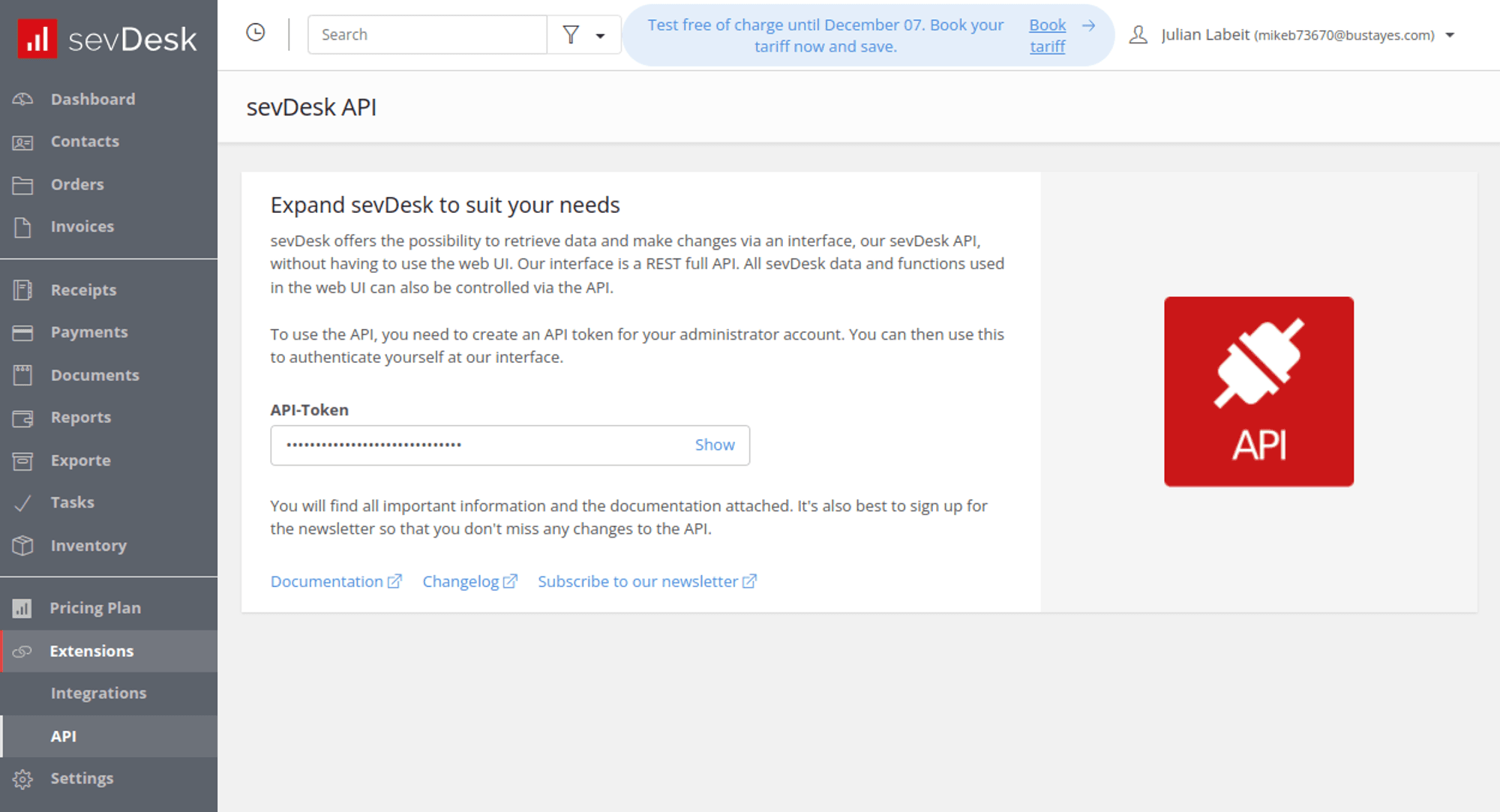 Erstellen Sie einen API-Schlüssel unter SevDesk API und senden Sie ihn an das IMPARGO-Kundendienstteam.