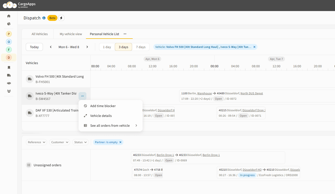 Jede Fahrzeugzeile bietet Aktionen zur Planung und Verwaltung direkt im Dispoplan.
