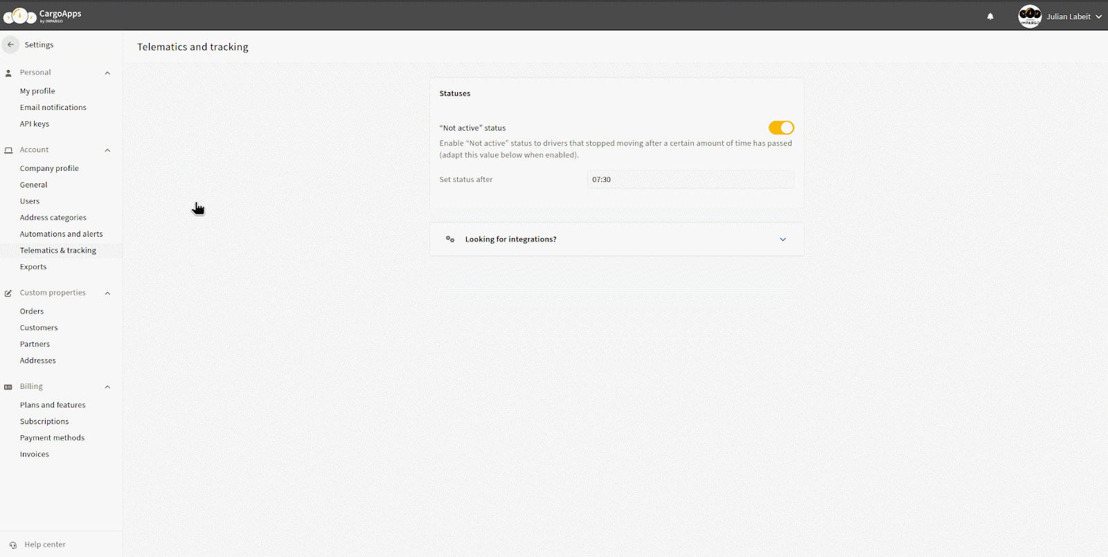 Der Bereich Flottenintegrationen ermöglicht es Ihnen, Ihren Telematikanbieter mit der IMPARGO TMS-Plattform zu verbinden. Diese Integration ermöglicht die Echtzeit-Synchronisierung von Fahrzeugdaten wie Standorten und Routen.