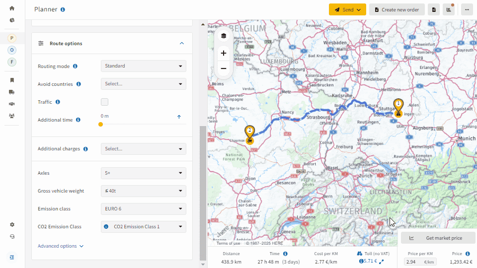 Choose toll and routing relevant parameters like number of axles, vehicle gross weight, etc.