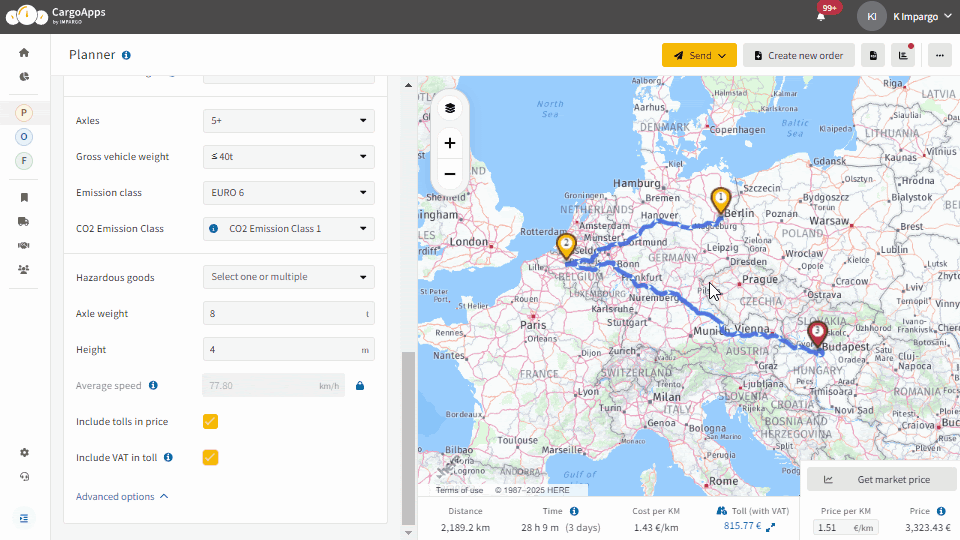 Save time and simplify toll estimation with IMPARGO's exclusive Route Mass Calculation feature. This tool allows you to efficiently calculate tolls for multiple truck routes in one go, streamlining your planning process and improving accuracy. With this powerful feature, logistics professionals can obtain cost estimates quickly, enabling better decision-making and optimized route planning for fleets of any size. Discover how Route Mass Calculation can enhance your toll management and improve your overall logistics efficiency.