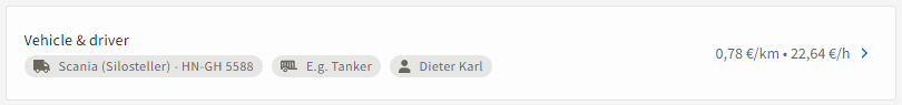 Step 3: Select vehicle, trailer and driver. Start the offer creation by selecting a vehicle, trailer, and driver, as these choices are essential for accurately calculating costs. The system estimates the transport offer cost using the chosen company, vehicle, and driver profiles, providing an initial financial overview.