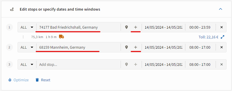 Add additional time at stop for accurate cost estimation by clicking on “+”.