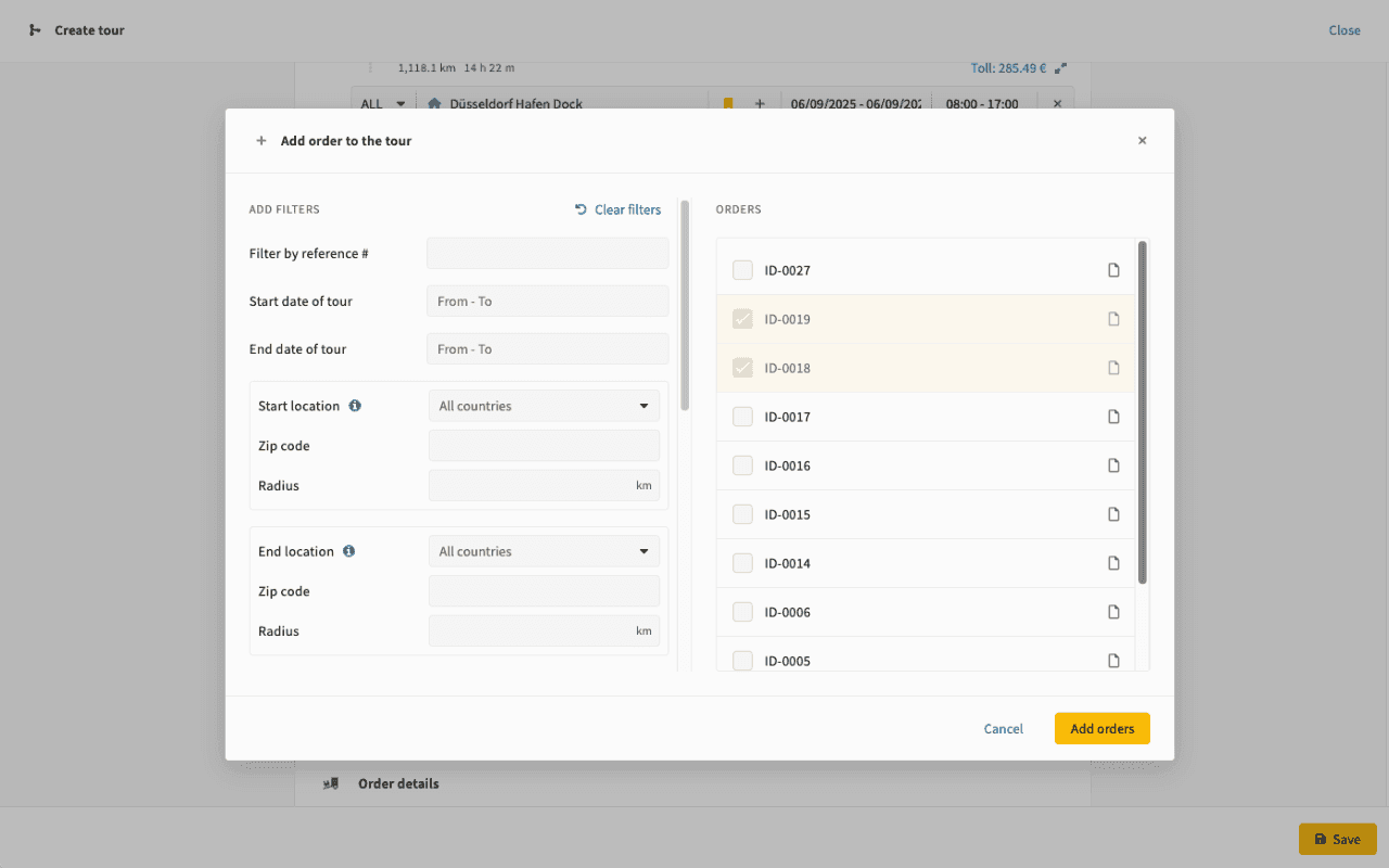 Visualisez l'ensemble de votre flotte d'un seul coup d'œil grâce à notre fonction Dispatcher Overview. Visualisez toutes vos commandes avec les horaires sur un seul écran, suivez votre camion / poids lourd sur une carte en direct, planifiez et surveillez les itinéraires des chauffeurs et obtenez des mises à jour de statut en temps réel. Cet aperçu visuel vous permet de prendre des décisions fondées sur des données, ce qui se traduit par une meilleure affectation des ressources et une amélioration de l'efficacité globale.