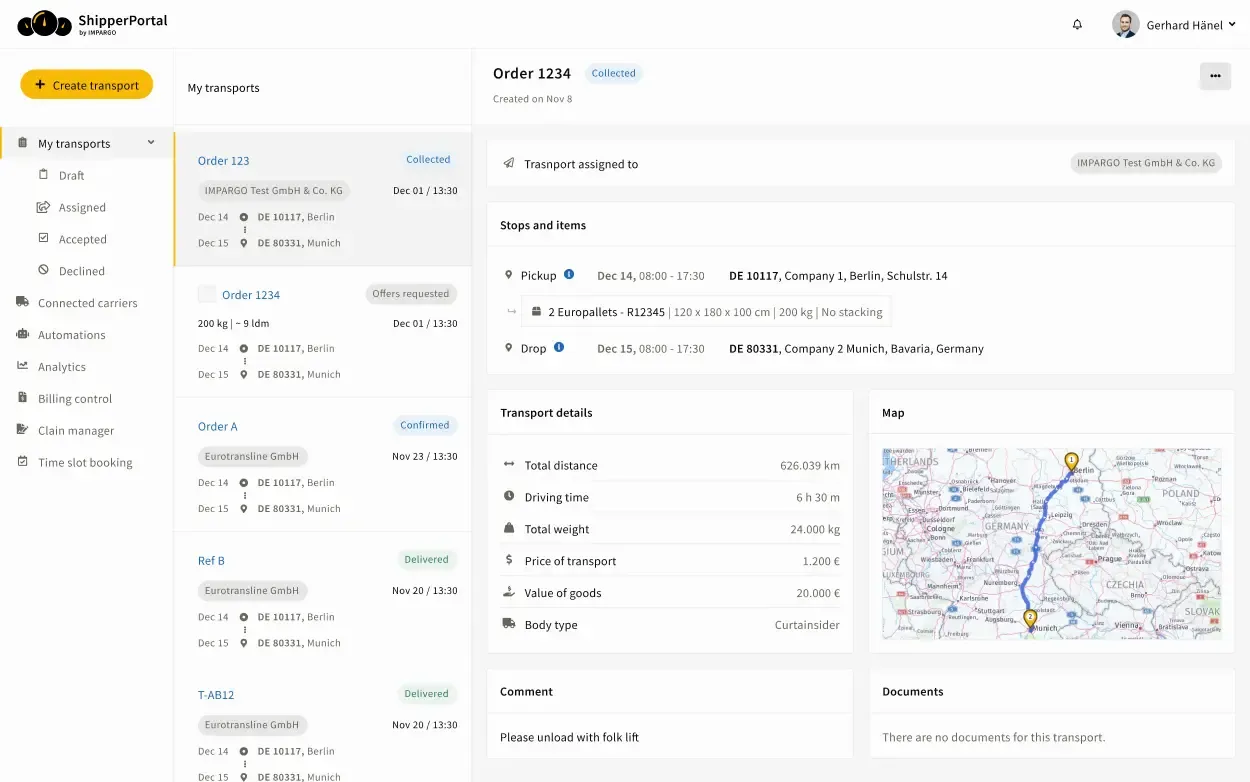 Gardez le contrôle sur vos ordres de transport, les itinéraires et les émissions. Envoyez les missions à vos partenaires, suivez l’état d’avancement en temps réel et générez des rapports CO₂ conformes à la norme ISO 14083. IMPARGO s’intègre facilement à votre ERP.