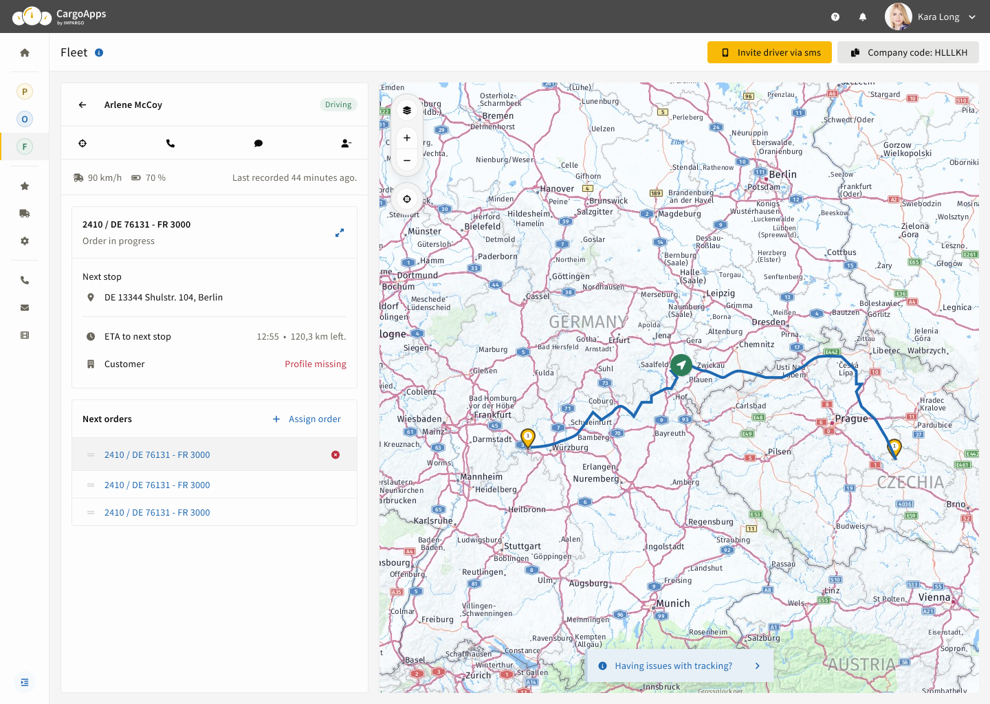 Dobre wieści! Mamy dla Ciebie najlepszą ofertę! Zarejestruj się, aby skorzystać z bezpłatnego 14-dniowego okresu próbnego i jak najlepiej wykorzystaj funkcje CargoApps. Dzięki naszemu oprogramowaniu możesz zoptymalizować swoje operacje logistyczne, np. zaoszczędzić do 20% czasu na planowaniu tras ciężarówek, zautomatyzować przetwarzanie zleceń transportowych, system telematyki ciężarówek i uzyskać ETA, a przede wszystkim - zwiększyć swoją rentowność. Zdigitalizuj swoje operacje logistyczne z dnia na dzień i zacznij optymalizować swoje trasy już teraz.
