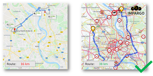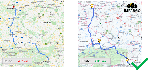Eddy berichtet, dass er “bereits in der ersten Woche der Zusammenarbeit mit seinem neuen Auftraggeber schon enorme Kilometerunterschiede zwischen gefahrenen und abgerechneten Kilometern festgestellt hat.” Nachdem er den Auftraggeber angesprochen hat und klar wurde, dass mit Google Maps abgerechnet wurde, setzte Eddy bei seinem Auftraggeber das IMPARGO Entfernungswerk als Abrechnungsgrundlage durch. “Ich schickte denen im Anschluss den Link zur LKW-gerechten Route und den Screenshot der Route. Der Auftraggeber hatte dazu kein weiteres Argument mehr. Die CargoApps haben mir so in kurzer Zeit die Firma gerettet.” Bei folgender Route konnte Eddy beispielsweise 39 Kilometer mehr abrechnen: